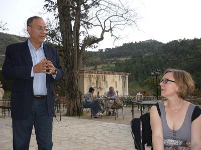 Im Garten des Gästehauses bekommen wir zunächst Theorieunterricht und auch jede Menge Lehrmaterial: Gerhild erzählt zusammen mit einem Winzer der Cave de Vignerons de Mont Ventoux das Wichtigste über die Weine der Region, die Weinanbaugebiete, Rebsorten, Terroirs, die Höhenlagen und das Klima. Die alte Platane muss als Kartenhalter dienen. Begeistert führt uns der französische Winzer seine Wetter-App vor, so hat er seine Weinberge wettermäßig voll im Griff ...