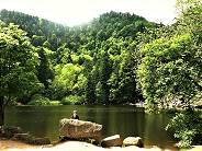 Wir folgen dem Tipp eines Wanderers und gehen in Richtung Fischboedle: Bewaldete Hügel rahmen den leicht abgelegenen See ein. Wer aus dem kleinen überdachten Pavillon blickt, entdeckt einen sanften Wasserfall in der Ferne. Aus der Idylle heraus beschließe ich, dass der Pfad viel zu langweilig ist. Ein Berghang aus Steingeröll zieht meine Aufmerksamkeit auf sich. Da will ich rüber! Gedacht - getan: 1,5 Stunden vergnügen wir uns daraufhin im Hagel und Regen mit Rutschen, Klettern und Schürfwunden sammeln ...