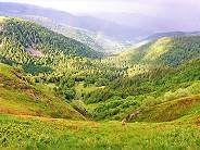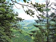 Vor uns ein Gemälde aus Hügeln, Wäldern und