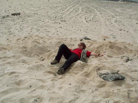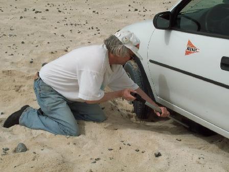 Während das Opfer und ein Fallensteller vorne nach erfolgter Grabung hart anschieben, fährt der andere Fallensteller das Fahrzeug mit "Fußspitzengefühl" rückwärts aus seinem Sandloch - mit zügiger Fahrt und ohne anzuhalten gelingt es, das Fahrzeug wieder zurück auf die Piste zu bekommen. Dauer der gesamten Befreiungsaktion: ca. 15 Minuten ...