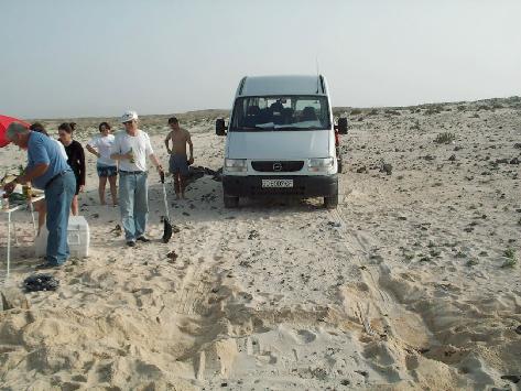 Wirklich spektakulär - rund sechs (!) einheimisch wirkende Personen mit einem Opel-Transporter sind in die Falle gegangen! Während die Frauen zum Strand gehen, bemühen sich die Männer nun schon seit gut einer Stunde, das Fahrzeug frei zu bekommen - natürlich vergeblich mit immer dem selben Ergebnis: Sie sitzen am Ende so tief fest wie nie ...