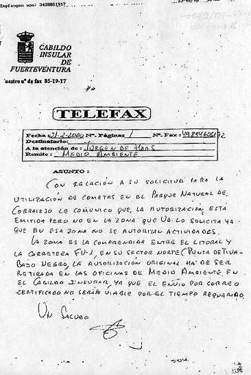 " ... vom 2.3. bis 11.3.2000 verbringen wir einen Aufenthalt im Norden Fuerteventuras. Letztes Jahr wurden wir von Ihren Beamten darauf hingewiesen, dass das Steigenlassen von Drachen in den Dünen westlich der Strasse vor dem Hotel Oliva Beach nur mit Genehmigung Ihrer Behörde gestattet ist. Deshalb beantragen wir eine Genehmigung, in der Zeit vom 02.03.2000 - 11.03.2000 in den Dünen von Corralejo (westlich der Straße vor dem Hotel Oliva Beach) privat Cometas steigen zu lassen (nicht kommerziell). Es wäre sehr freundlich, wenn Sie uns die Genehmigung faxen an: ..."