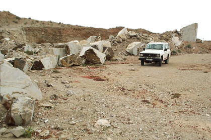 Wir erreichen eine weitere T-Kreuzung (N28°35,99´ W013°59,13´) auf dem Weg zu unserem gesuchten Punkt am 401 m hohen Tindaya. Schon bald nähern wir uns auf einer nach oben führenden Piste dem Marmor-Steinbruch (N28°35,83´ W013°58,81´) am Fuße des Berges. Hier geschieht allerdings merkwürdiges: Wir müssen in dieser menschenleeren Einsamkeit drei (!) Touristinnen, die uns offensichtlich den Weg nicht freigeben wollen, mit unserem Patrol durch langsames, aber stetiges Vorwärtsfahren vom Wege verscheuchen ...