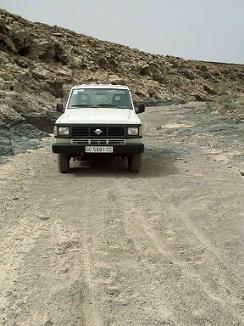 Wieder Windstärke 6 oder mehr heute! Also rein ins Auto und los. Aber wir machen es uns einfach oder auch nicht. Schließlich wollen wir laut Karte zwei "archäologisch" interessante Punkte in der Nähe des "heiligen" Berges Tindaya finden, und die erreichen wir vielleicht nicht am einfachsten, aber doch auf dem interessantesten Weg, wenn wir einem Teil unserer Vorjahresstrecke entlang der Westküste nach Süden folgen und dann abbiegen - mal sehen, was wir finden! Unser diesjähriger Nissan Patrol ist ein solides Arbeitspferd und so können wir ihm und uns einiges zumuten ...