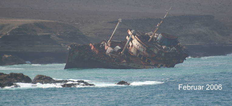 Wir sind wie schon so oft wieder am Schauplatz des traurigen Geschehens an der Westküste Fuerteventuras - vor uns liegt diesmal das weltberühmte Wrack in seiner "neuen" Lage, stark verkürzt und stark reduziert - wie wir schon seit Ende des Vorjahres wissen, fehlt mittlerweile nicht nur sein hinterer Schornstein, sondern auch noch ein großer Teil des zur See gewandten Teils vom "Heck" des Vorschiffs. Noch gibt es zwar die drei markanten Masten am Vorderteil des Wracks, doch auch deren Verschwinden dürfte nur eine Frage der Zeit sein, wenn man die See beobachtet, während die Flut donnernd einrollt ...