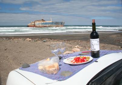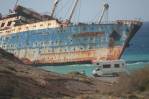 Diesmal ist es wirklich traurig. Vom ersten Moment an, wenn es nämlich hinter der Biegung der Piste wieder zum ersten Mal in der Bucht gegenüber schemenhaft sichtbar wird. Und wenn dann das "ganze" Schiff wie eh und je allmählich auftaucht: Es liegt nun tatsächlich so schräg wie ein gestrandetes Geisterschiff in seiner Bucht - trotz Sonnenschein auch an diesem Tag wird dem, der es schon länger kennt, wehmütig um´s Herz.