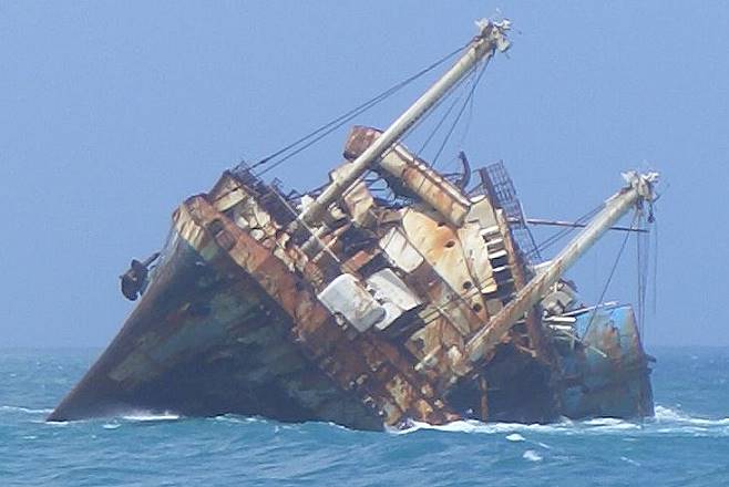 Among others, the bridge structure completely collapsed and the wreck´s prior critical slant to the seaside has even further increased. When considering the remnants of a few containers corroding on shore above the ship and from which there are only rusty skeletons left facing the sky and looking spooky and bizarre, you know how the aggressive salty air will literally eat the bits of metal still left of the "American Star" in the next few years.