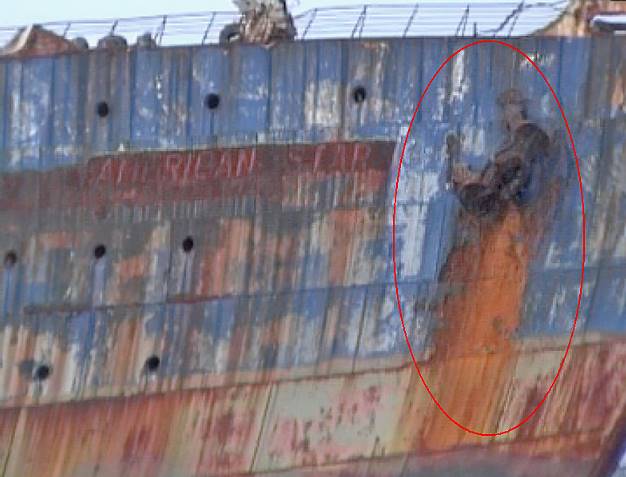 Schon häufiger konnte man auf Luftbildern gewisse Umrisse des abgebrochenen Heckbereichs erkennen (siehe z.B. Luftbild vom Oktober 2004 im Beitrag "Der Zahn der Zeit"), aber dieser neue Anblick war dann doch mehr als verblüffend! Wir setzten uns sofort mit Bill Lee in Verbindung, der als Experte für die "Autopsie" der AMERICAN STAR ebenfalls überrascht war, wie die Übersetzung seiner Analyse zeigt ...