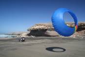 Mit diesen und anderen Zeilen unserer Leser in der Erinnerung sind wir also wieder vor Ort und lassen uns erneut von der Stimmung an den kargen Buchten einfangen, vor uns das zerborstene Wrack, gegen das unablässig weiter die Wellen anbranden (Bild unten links), neben uns auf der Anhöhe ein Filmteam von Fuerteventura TV, das vor dieser einzigartigen Kulisse einen Film dreht (Bild unten Mitte) und dicht bei uns auch unser Jumping Wheel, das an unserem Defender befestigt ständig auf- und absteigend in der frischen Seebrise einen angenehmen Kontrast vor der felsigen Landschaft bietet (Bild unten rechts) - eine Umgebung, die eine fast schon meditative Stimmung fast wie von selbst befördert ...