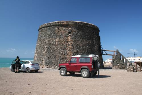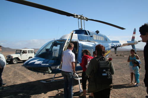 We park our cars at the old pirates’ tower next to El Cotillo’s new harbor from where we will take-off. We wait for Christian with whom we want to meet today and who arrives on time in his vehicle showing visibly "Helicopter Flights Rundfluege" including the phone number.