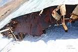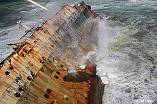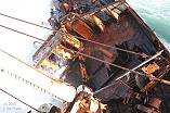 From this perspective, the wreck below us seems to be in horrible condition - due to our today’s photographs - Bill Lee will have to update the "autopsy" by the sea. All structures are already broken off; remaining only parts of the upper deck that was constructed as the upper part of the hull structure. While we are floating above the waves and the remaining loading masts, you can clearly see sunrays shining onto the water through the holes of the few remaining ship walls. However, the enormous hull below us still looks respectable from this perspective - the massive rusty parts in close distance are still showing the ship’s dimensions from which there is only a quarter of its original length left ...