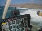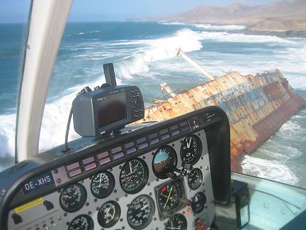 We started a little later than planned since our "Jet Ranger" had been transferred from Gran Canaria. The wind blows pretty strong which we do not feel in Hermann's helicopter until we open the big side door when above the wreck. The light is favorable and we look at a major surf rolling in - it is high tide.