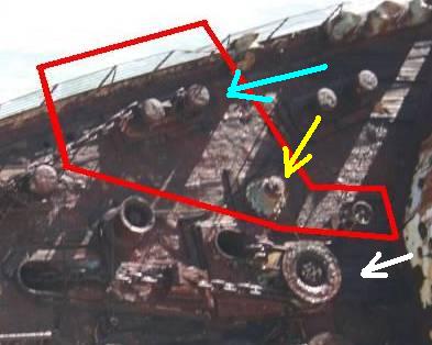 The three larger pieces of debris visible in this photo appear to be (left to right): (1) a fairly large electric motor, perhaps one that drove the port-side capstan (it was positioned vertically, directly beneath the capstans show above, and below the weather deck in what was called the Capstan Motor Room), (2) an air tank (probably located in or near workshops there were located below the weather deck, just aft of the breakwater that appears behind the anchor windless gear and spare anchor in the above picture), and (3) a piece of the hull, at what is called the 'turn of the bilge', but upside down.