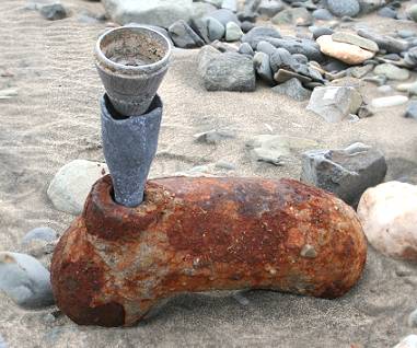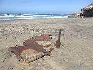 So here we are again, as usual, at the Playa de Garcey: The minimum low tide during our visit is unfortunately a little bit higher than last year, as we can clearly notice. The remains of the bow appear little changed and the field of debris is still visible. Everything seems to be there: electric motor, air tank, anchor, remains of the hull. So we take pictures as usual and the current state of decay is documented ...