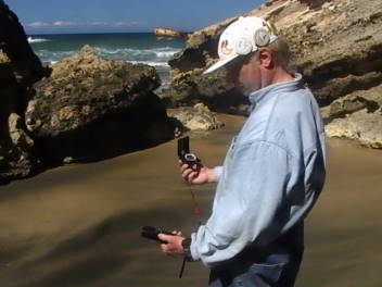 Wir erreichen die Playa de Garcey: Bei Niedrigst-Ebbe, deren Zeit wir vorher bestimmt hatten, wollten wir einen Blick auf die Überreste des hinteren versunkenen Bugteils werfen. Außerdem hatten wir mit Bill Lee abgestimmt, dass wir etliche Messungen vornehmen wollten, um die Lage der Bugspitze zu überprüfen, hatten wir doch verschiedentlich den Eindruck bekommen, sie hätte sich möglicherweise nach rechts und weiter in Richtung zum Strand verschoben ...