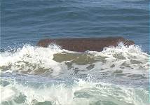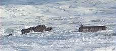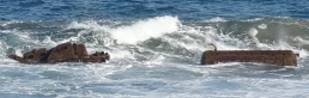 Da sind wir also wie üblich schon wieder an der Playa de Garcey: Die minimal mögliche Ebbe bei unserem Besuch liegt diesmal leider etwas höher als im Vorjahr, wie wir deutlich bemerken können. Die "Reste vom Bugrest" erscheinen nur wenig verändert, auch das "Gerümpel" in der Umgebung ist noch sichtbar. Alles da: Elektromotor, Tank, Anker, Reste der Bordwand. Also wie üblich draufgehalten mit dem Tele und schon wieder ist der einst militärisch verstärkte Bugrest im Kasten ...
