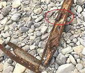 Der Decksrest von der Unterseite aus gesehen, wie er sich heute dem Betrachter am Ufer bietet, zeigt das Bild unten links. Auf der abgewandten Seite dieser Ansicht befinden sich die im Überflug festgehaltenen Poller am Bug (Bild oben rechts), die von Land aus gar nicht gesehen werden können.