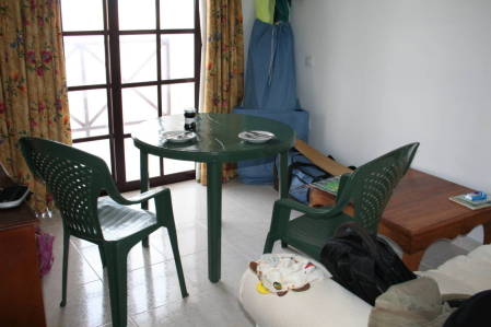 Kernpunkte des Apartamentos-Aufenthaltes betreffen die Beachtung wichtiger Regeln zu Generator, Elektrik, Batterie, Steckdosen, Dusche, Mikrowelle und Warmwasserboiler, die alle in mehr oder weniger geheimnisvollem Zusammenhang stehen. Der Dieselgenerator (Huch, die Preise sind so stark gestiegen in letzter Zeit!) soll angabegemäß laufen von 8:00 bis 10:30 Uhr, von 12:00 bis 13:30 Uhr und schließlich noch von 18:00 bis 22:30 Uhr. Nur in dieser Zeit, so wird betont, könne man natürlich kochen, denn dafür braucht man schließlich viel Strom. In dieser Zeit wird auch die Batterie geladen - Steve zeigt auf den Küchenschrank, wo ein schwarzes Gerät mit diversen Zu- und Ableitungen liegt, das in der generatorlosen Zeit dann die Stromversorgung des Apartamentos übernimmt. Also ist wohl auch Duschen nur während der Generatorlaufzeit angesagt und auch dann nicht allzu lange: Steve macht Andeutungen in Hinblick auf die Boilerkapazität. Wir bekommen die Telefonnummern von Steve und Carol für Notfälle ausgehändigt: Steve erwähnt im Gehen noch Batteriealarme, die Touris schon ausgelöst hätten, als sie die Apartamentos bei voller Beleuchtung verließen ...