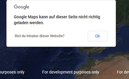Wer ohne API-Key Google Maps per Programmierung in seine Webseite integrieren will, kann dies tun, jedoch erhält die eingebettete Karte dann das Wasserzeichen "For development purposes only" und man bekommt einen Warnhinweis. Nach Bestätigung des Hinweises ist die Karte bis auf die störenden Wasserzeichen funktionstüchtig.