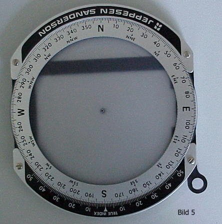 Und noch was zum Abschluss: Selbstverständlich brauchen wir Gradangaben (und vielleicht auch Minuten und Sekunden) nicht nur zur Positionsbestimmung, sondern auch zur Richtungsangabe auf der Erdoberfläche! Hier hilft uns auf einfache Weise die so genannte Kompassrose. Sie zeigt wie auch unser "Flight Computer" die Richtungen und die dazu gehörigen Gradzahlen (Bild 5).