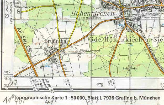 Am Rand der obigen Karte erkennt man das Gauß-Krüger Gitternetz, das für deutsche topographische Karten typisch ist. Auf diesen Karten erfolgt der Hinweis, dass Gauß-Krüger-Koordinten nicht identisch sind "mit den Koordinaten ähnlicher Abbildungssysteme (z.B. UTM-Koordinaten des UTM-Meldesystems)."