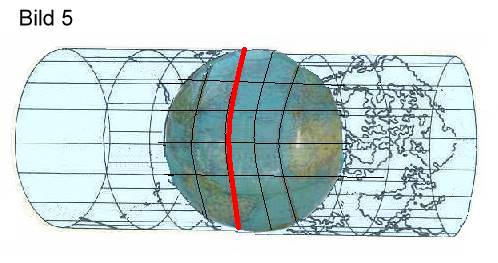 Eine Modifikation der oben dargestellten Mercator-Projektion (Bild 3) stellt die sogenannte "transversale Mercator-Projektion" dar, bei der der Zylinder waagerecht über den Globus gestülpt wird (siehe Bild 5).