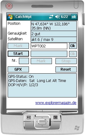 oder neuer Funktionsweise:Die App baut zunächst eine Verbindung zur eingebauten GPS-Schnittstelle auf und zeigt die wesentlichen Informationen an, die man aus der GPS-Schnittstelle ermitteln kann. Somit kann dieses Programm auch als Testprogramm für die GPS-Schnittstelle und den GPS-Empfang genutzt werden. Zusätzlich wird - solange CatchWpt aktiv ist - die Abschaltung des PDAs unterbunden, damit CatchWpt sofort zur Verfügung steht. Mit einem Klick auf "Mark" wird die aktuelle Position registriert und erhält einen Namen WPT + lfd. Nummer (z.B. WPT001). Mit anschließendem Klick auf "Ok" wird der Wegpunkt gespeichert. Mit einem Klick auf "Start" wird der Routenmodus aktiviert. Die Route erhält einen Namen RTE + lfd. Nummer (z.B. RTE001). Mit anschließendem Klick auf "Ok" wird die Route gespeichert. Nun kann man auf der Route mit der unteren Schaltfläche "Mark" die Wegpunkte der Route speichern. Mit einem Klick auf "Stop" wird der Routenmodus wieder beendet. Alle Wegpunkte, die mit "Mark" zwischen "Start" und "Stop" gespeichert wurden, sind dieser Route zugeordnet. Mit einem Klick auf "GPX" werden die Wegpunkte und Routen im GPX-Format bereitgestellt. Die erzeugten Dateien befinden sich im Anwendungspfad und heißen