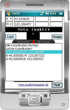 oder neuer. Das Gerät muss man vor sich halten, so dass man die Anzeigen gut ablesen kann. Funktionsweise:Die App baut zunächst eine Verbindung zur eingebauten GPS-Schnittstelle auf und zeigt die wesentlichen Informationen an, die man aus der GPS-Schnittstelle ermitteln kann. Somit kann dieses Programm auch als Testprogramm für die GPS-Schnittstelle und den GPS-Empfang genutzt werden. Zusätzlich wird - solange Goto aktiv ist - die Abschaltung des PDAs unterbunden, damit Goto stets Entfernung und Richtung zum gesuchten Wegpunkt anzeigen kann. Sobald man den Cursor in eines der Eingabefelder positioniert, wird die Tastatur aufgeblendet und man kann die Daten des Wegpunkts erfassen.. Mit einem Klick auf "Los" errechnet Goto anhand der aktuellen Position Richtung und Entfernung zum gesuchten Wegpunkt. Dieser Wegpunkt wird gespeichert. Als weißer Pfeil wird die Richtung zum Wegpunkt angezeigt. Man ist auf dem richtigen Weg, wenn der weiße Pfeil nach oben (auf die rote Markierung) zeigt. Um seine Richtung korrigieren, bewegt man sich in Richtung des weißen Pfeils. Zusätzlich wird als türkiser Pfeil die Richtung nach Norden angezeigt. Über der roten Markierung wird die tatsächliche Bewegungsrichtung angezeigt. Steht man, sind alle Angaben zu den Richtungen aufgrund der Restriktionen der GPS-Technologie zufällig und somit zumeist falsch. Mit einem Klick auf "MoB" wird die aktuelle Position gespeichert. Mit einem Klick auf "Stopp" beendet Goto die Berechnungen, bleibt jedoch aktiv. Es werden die gespeicherten Wegpunkte angezeigt (eingegebene und per "MoB" gespeicherte). Aus der Liste kann man einen Wegpunkt anklicken und mit "Los" wieder dorthin finden. Ebenso kann man die Liste mit "Alle Koordinaten löschen" wieder bereinigen. Mit einem Klick auf "ok" (rechts oben) wird die App beendet. Erläuterung der Anzeige:
