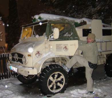 Es fällt mir schwer, breitbeinig und mit den Händen an den Unimog