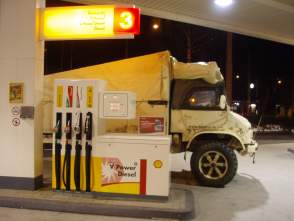 Der Tankwart klatscht bereits, als ich auf den Hof rolle: Meine fahrende Schrankwand braucht 34 Liter Super Benzin + Bleizusatz auf 100 km. Meine Kreditkarte ist einen Zentimeter dünner, nachdem der Unimog seinen Durst gestillt hat: Hätte ich statt OBS und Biltong doch nur etwas von dem günstigen Benzin aus Namibia mitgenommen!