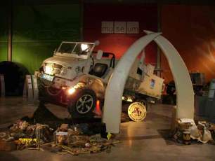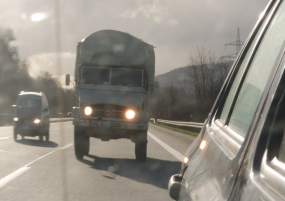 Die Beschleunigung des Unimogs presst mich in die Sitze: Langsam kommt die Rückseite eines Gefahrgutlasters näher. Blick in den Außenspiegel. Überholen unmöglich, da auf der Überholspur hinter mir ein Fahrzeug mit sagenhaften 86 km/h heranrast. Will der mich nun überholen oder überlisten? Wenn man bedenkt, dass heute in jedem City Golf mehr Elektronik steckt als in der Saturn V, die 1969 drei Menschen auf den Mond beförderte, verwundert es umso mehr, wie wenig Gehirnzellen es bedarf, um in Deutschland Autofahren zu dürfen. Umso beharrlicher inszeniert man hier in Bewegungsreservaten Scheinmobilität. Gerade die vierspurige Autobahn als Asphalt gewordene Blockierung der Landschaft gestattet ja die beispiellose automobile Individualmobilität von gleich aussehenden tropfenförmigen Fahrzeugen.