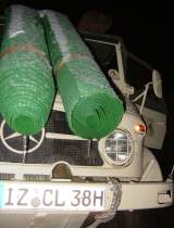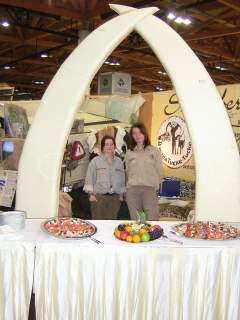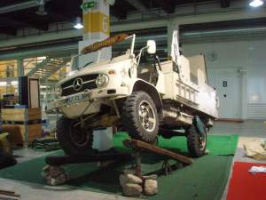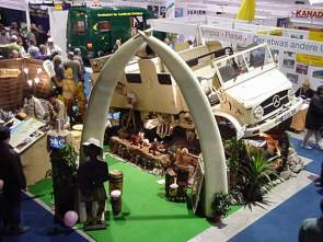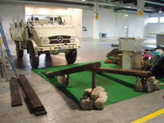 Autobahnabfahrt, im zweiten Gang in einer "verkehrsentsorgten Zone" durch die Innenstadt und dann endlich angekommen: Es warten schon die Gefährten von Arifu-Tours und von der Naua Naua Lodge, um beim Aufbau des Messestandes zu helfen. Routiniert wird in 8 Stunden der Kunstrasen verlegt, die Rampe aufgebaut und der Unimog mit Einweisungszeichen auf die "kollabierende Brücke" gewunken.