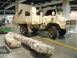 dem Parkplatz angekommen stehen zwei Polizisten am Unimog und überprüfen