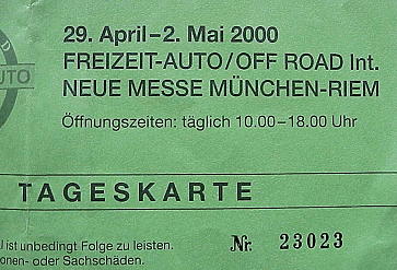 Nun sind wir also wieder da - nach Bad Kissingen 99 als Besucher einer Veranstaltung, die sich erneut wieder nicht IOR nennt, sondern dieses Jahr "Freizeit-Auto/OFF ROAD International". Wie Alfons Czerny dieses Jahr im Editorial des offiziellen Messekataloges schreibt, soll "das bedeutendste Ziel für die Maitour 2000 ... in München nun einmal die größte Ausstellung für Auto-Individualisten ..." sein - wahrhaft große Ziele! Und weiter: "Die Neue Messe München ist für einige Tage das Eldorado der Geländewagenfreaks, der Sport-Utility-Vehicle-Fans und der Van-Enthusiasten. Auf 50.000 Quadratmetern präsentieren Fahrzeug- und Zubehörhersteller ihre Angebote. ... Auf verschiedenen "Event-Inseln" in den Hallen und auf dem Freigelände werden z.B. Pferdenarren, Berg- und Wassersportler, Rad-Enthusiasten und andere Freizeitaktive angesprochen, für die die ausgestellten Freizeitfahrzeuge zusätzliche Vorteile bieten."