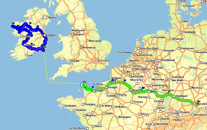 Doch mit diesen Überlegungen begannen auch schon die Probleme: Für die immer viel zu kurzen Exkursionen war hier schon eine ganz beachtliche Anzahl von Kilometern mit dem Fahrzeug zurückzulegen, auch wenn man nicht unbedingt zusätzlich noch die "Fahrfreuden" auf der britischen Insel und der falschen Straßenseite dabei genießen wollte. Obwohl heutzutage dank Navi sicherlich ganz erheblich angenehmer als noch vor Dekaden bei Touren wie Schottland 98, war stattdessen dann eine lange Fährfahrt einzukalkulieren: Um England herum bis zur Hafenstadt Rosslare.