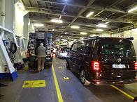Trotz eines hektischen und wild sinnlos herumgestikulierenden Einweisers an Bord der Fähre finden wir relativ problemlos einen Platz direkt an der Schiffswand und können nach oben zur Kabine und weiter an Deck steigen.