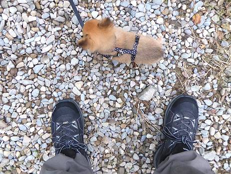 eine Nachbar hat einen geradezu winzigen Hund dabei, der sich im