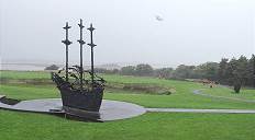 Am heutigen 21. August ist wieder mal viel los am heiligen Berg, auf dem einst der Heilige Saint Patrick 40 Tage lang gefastet haben soll und wo es erst am Monatsanfang wieder einen Riesenansturm von rund 20.000 Pilgern gegeben hat. Auch heute soll hier eine publikumswirksame Besteigung stattfinden. Entsprechend ist auch der Rummel am Parkplatz am Fuße des Bergs: Eine Band spielt, bei Regen und heftigem Wind schaffen es Ordner nur mit Mühe, den Verkehr hier unten entsprechend zu bändigen und einzuweisen. Zu allem Überfluss ist am Berg offenbar auch wieder mal etwas passiert, wie so oft ist dort ein "Pilger" in Problemen und muss gerettet werden. Doch der an diesem Berg wohl regelmäßig operierende Helikopter der Coast Guard schafft es nicht, bei den herrschenden Wind- und Wetterverhältnissen hier unten zu landen. Vergeblich warten die in Orange gekleideten Helfer draußen im Gelände während der mehrfach versuchten und schließlich abgebrochenen Landeversuche - am Gelände mit dem Famine Monument - dem Erinnerungsmemorial an die Große Hungersnot in Irland zwischen 1845 und 1849 ...