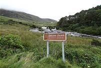 Als wir an einem verwitterten Steinkreuz in nebligem Umfeld Halt machen und aussteigen, werden dem Besucher die Tragödien voll bewusst, die sich in dieser Landschaft abgespielt haben. Das Kreuz wurde zum Gedenken an die Opfer der "Doolough Tragedy" errichtet, die es im Jahr 1849 gab, als sich während der Großen Hungersnot Hunderte von Menschen in der Ortschaft Louisburgh sammelten und von da aus aufbrachen zum Marsch Richtung Delphi Lodge, um dort bei den Verantwortlichen um Nahrungsmittel zu bitten. Sie machten den Marsch allerdings vergeblich, denn sie mussten mit leeren Händen zurückkehren und etliche der Bittsteller kamen bei diesem Marsch ums Leben, viele verhungerten und erfroren in diesem Doolough Valley.