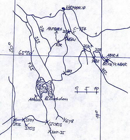 Das Gebiet der Eyvindarstadaheidi hat größtenteils gute Wege. Die Auffahrt zu einem Berg mit Antennen "ANTBERG" war recht nett. Das GPS pendelte sich auf etwa 947 m ein. Im Plan steht 925 m und irgend jemand muss sich wieder einmal vermessen haben. Die Auffahrt beginnt bei "KIR". Im Tal herrschte dicker Nebel und oben hatte ich tiefblauen Himmel und Sonnenschein. Auf dem Rückweg war ich das erste mal froh, mit GPS zu fahren, da ich im Nebel nicht ausmachen konnte, welche Abzweigungen ich in welcher Reihenfolge und in welcher Richtung nehmen sollte, um wieder zurück zu kommen. Ich hatte vorher sämtliche Abzweigungen als Waypoints gespeichert und so wusste ich exakt, wo ich war und wie es weiter geht.