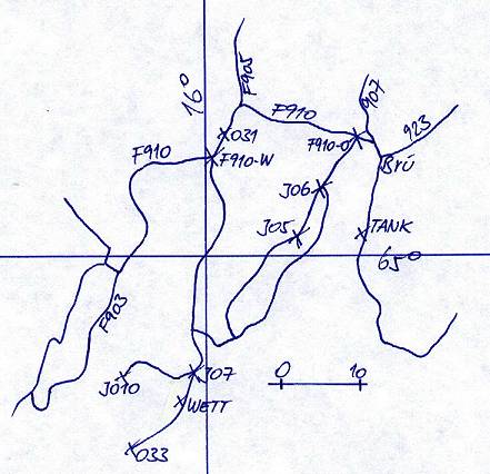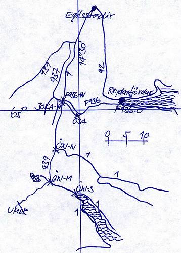 Bei "JO7" geht ein Abstecher zum Brúarjökull, fahren kann man etwa bis "033", dann ist bald Schluss. Im Westen ist noch eine Hütte an einem See, so etwa bei "JO10". Unterwegs kommt man bei "WETT" an einer kleinen Wetterstation vorbei. Es gibt in diesem Gebiet einige Abzweigungen, die in den Karten nicht enthalten sind und die einen armen Nicht-GPS-Besitzer verwirren könnten - aber für GPS-Besitzer dürfte alles kein Problem sein.