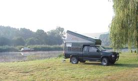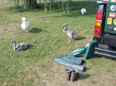Als wir am nächsten Morgen Zella verlassen, werden wir vom letzten deutschen Campingplatz auf unserer Fahrt angemessen verabschiedet: Die am Platz ansässige Schwan-Familie kommt mitsamt Nachwuchs zu unserem Fahrzeug gewatschelt. Zuerst schnappt nur der Nachwuchs neugierig nach herum liegenden Gegenständen, die gerade eingepackt werden, dann rücken fauchend die Eltern nach: Sie sehen offenbar überhaupt nicht ein, was die Explorer-Besatzung hierzulande noch verloren hat ...