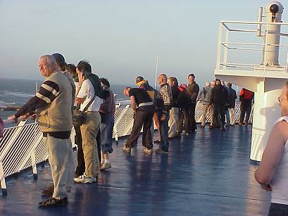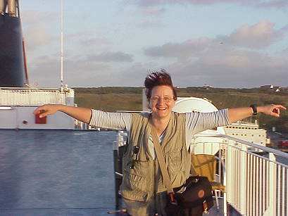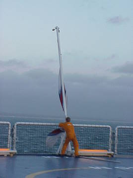 Am Heck bemüht sich ein Besatzungsmitglied fast vergeblich, die knatternde Fahne einzuholen - wir sind auf dem Weg ..!