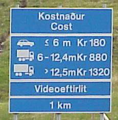 Vor dem Kreisverkehr ist ein Schild aufgestellt, das darauf hin weist, dass man Richtung Vágar eine "Tollroad" befährt, also Maut zahlen muss. Nun, das soll uns nicht stören, so hoch kann die Maut ja wohl kaum sein und schließlich ersetzt der neue Tunnel jetzt die früher zwischen den Inseln verkehrende Fähre. Wir biegen auf die "Tollroad" ein und lesen kurz darauf ein weiteres Schild: Man solle ruhig weiter fahren und erst bei der Rückfahrt zahlen.