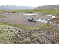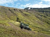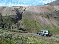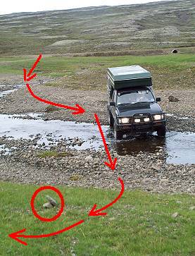 Mit Hilfe der Markierungen ist es kein Problem: Mit 4L-Untersetzung geht es im Schritttempo durch den Parcours und bereits kurz danach stehen wir an "unserem" wilden Camp (N64.811745° W014.640870°): Genau auf dem alten Öxi und in deutlicher Entfernung vom neuen Streckenverlauf, von dem aus man diese Stelle nicht einsehen kann ...