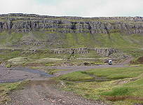 Die Einfahrt auf die Piste dicht bei Reyðarfjörður ist schnell gefunden - wir erwarten eine problemlose Befahrung aufgrund der Darstellung in der Karte. Die Piste scheint dabei nur wenige Höhenlinien zu kreuzen und sich durch verschiedene Täler zu schlängeln, um dann weiter östlich auf die Ringstraße 1 zu treffen, die um ganz Island herum führt. Etwas weiter im Süden würde dann schließlich der Öxi wieder die nächste Abkürzung Richtung Süden sein, wo wir zunächst hin wollen.