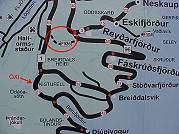 Wir haben uns viel vorgenommen für den heutigen ersten Tag in Island: Zunächst wollen wir uns die geplante Alcoa-Baustelle bei Reyðarfjörður (Karte/2) anschauen, das dortige "War Museum" besuchen und dann über die Piste F936 in Richtung auf den "Öxi" vorstoßen, wo wir die erste Nacht in Island verbringen wollen - "volles" Programm also!