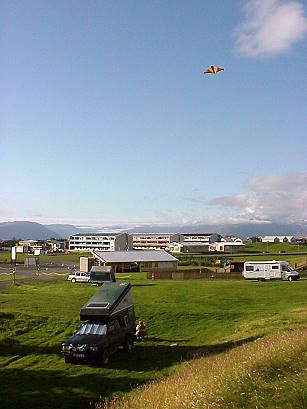 Wie lange dies in Anbetracht der Erderwärmung allerdings noch gelten wird, wissen wir nicht, als wir heute in Höfn einfahren, einer kleinen Stadt, die wir in all den Jahren bisher noch nie aufgesucht hatten (Karte/6). In Anbetracht des echten "Kaiserwetters" beschließen wir, sofort den Campingplatz des Ortes anzufahren und bereits kurz darauf sitzen wir in der Sonne, während weit über uns und in Sichtweite des Gletschers unser Leichtwinddrache "Open Keel Delta" wieder einmal im strahlend blauen Himmel steht (N64.258255° W015.203952°) ...