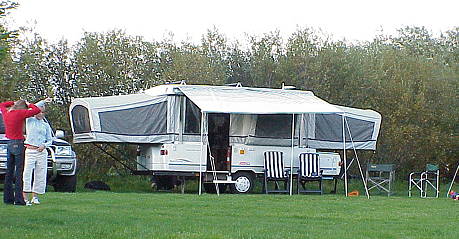 Wieder auf dem Campingplatz angekommen, lernen wir unsere neuen Nachbarn kennen: Ein älteres Schweizer Ehepaar ist dort mit seinem Mietcamper angekommen, der uns bestens bekannt ist: Ein Scamper, wie wir ihn bei unserem Besuch an genau dieser Stelle 1995 ebenfalls gemietet hatten ...