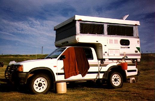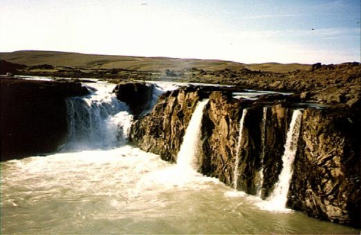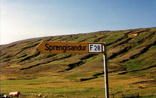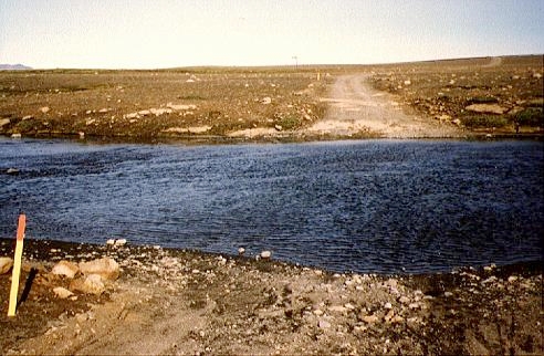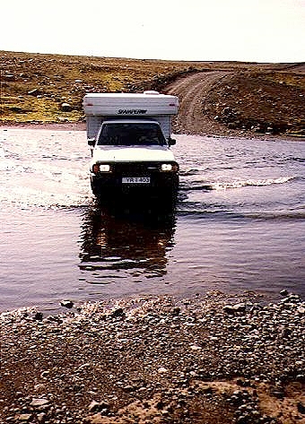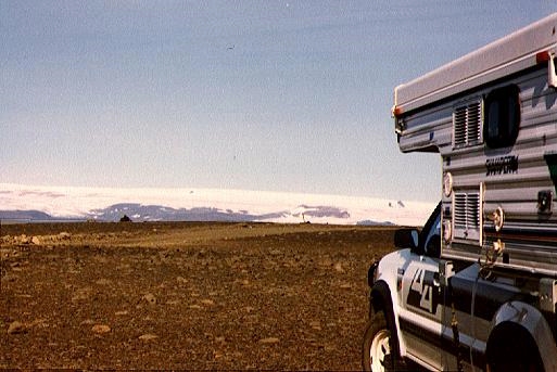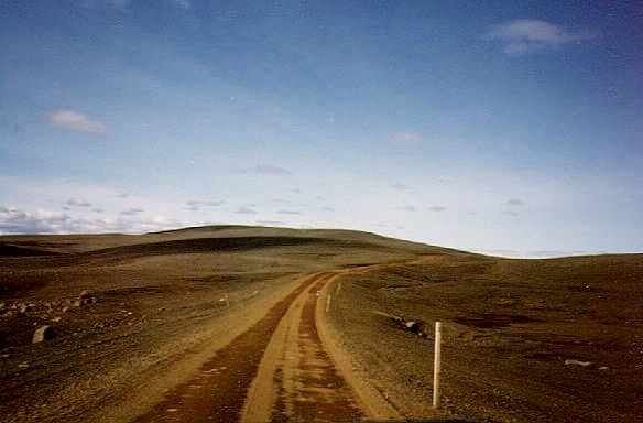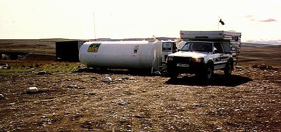 Zurück in die Gegenwart des August 1995: Kurz nachdem wir an diesem Morgen wieder auf die F28, den Sprengisandur, zurückgestoßen sind, begegnen wir einem ersten "Schwesterschiff": Die Besatzung des anderen Pickup-Campers winkt freundlich und bald verlieren sich unsere Staubwolken wieder. Es geht weiter nach Norden, wo wir bereits nach kurzer Fahrt in Versalir ankommen, einer recht einsamen "Sommertankstelle" (Hütte mit Tank vor der Tür). Wir nehmen das Warnschild mit Hinweis auf die Entfernung zur nächsten Tankstelle ernst und lassen unseren Tank trotz Ersatzkanister randvoll füllen, man weiß ja nie, was passiert ...